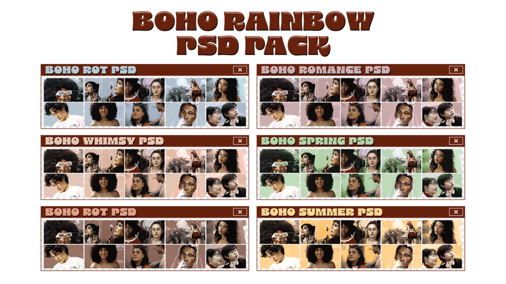 🌈 this pack contains 6 PSDS, an icy blue centric version called BOHO FROST, a minty green centric version called BOHO SPRING, a muted mauve centric version called BOHO ROMANCE, a muted pastel peach centric version called BOHO WHIMSY, a pastel yellow centric version called BOHO SUMMER, and a muted rust centric version called BOHO ROT.